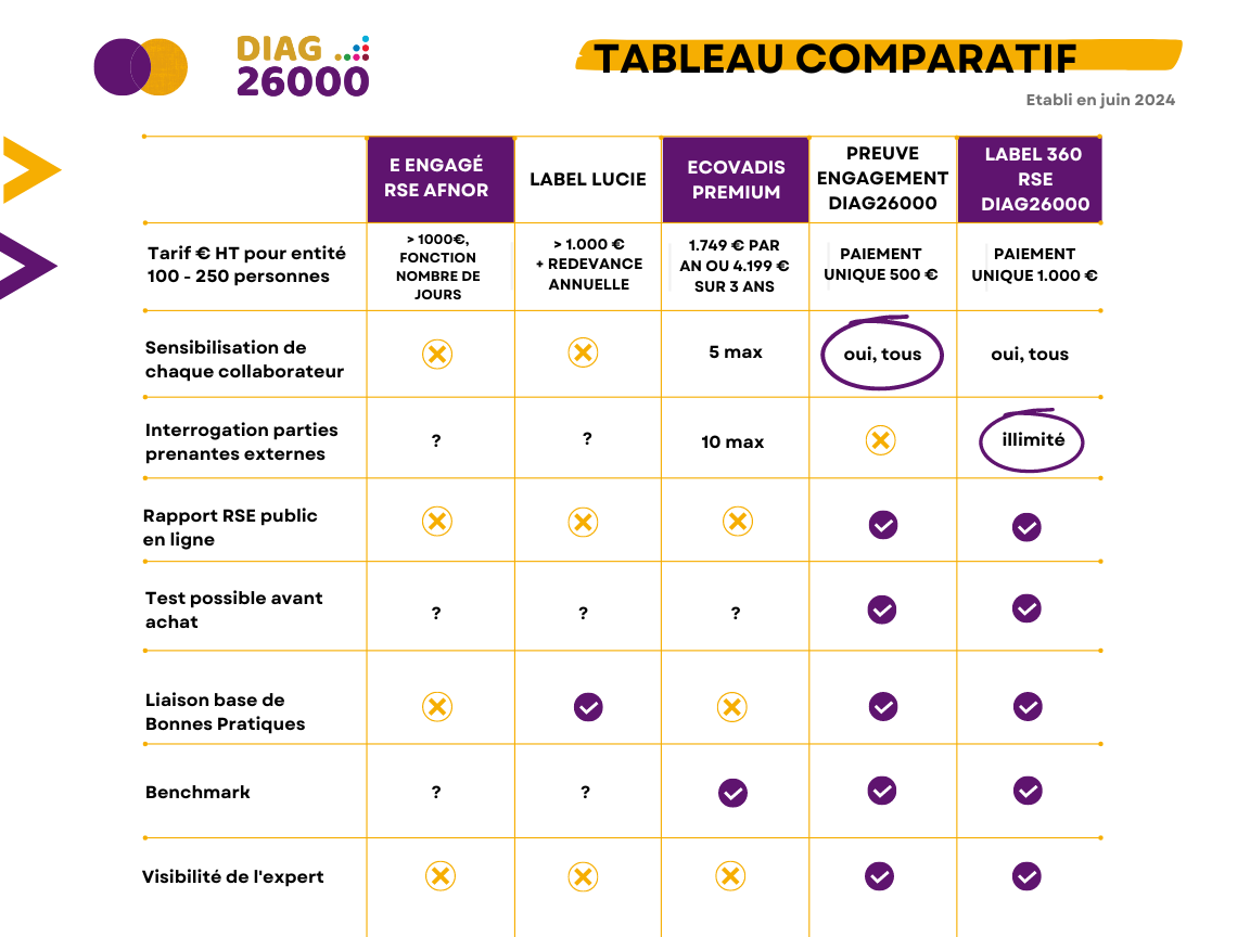 Si vous vous intéressez aux différents labels RSE, nous avons pensé qu’une rapide comparaison des principaux labels français pourrait vous intéresser. DIAG26000 est le seul à proposer d’impliquer tous les collaborateurs. Le tableau présente aussi le label 360 RSE : une extension qui vous permet de donner aussi la parole à vos clients, vos fournisseurs et autres tiers avec des grilles optimisées pour chaque type de partie prenante.