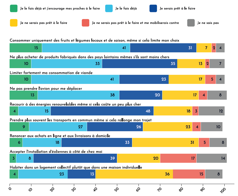 Une autre infographie résumait les rapports entre adhésion et resistance sur différents sujets. Le choix de ne pas acheter de produits fabriqués dans des pays lointains, même s’ils sont moins chers, arrivent en seconde position. Mais Temu, Shein et les véhicules électriques chinois étaient alors moins présents sur nos marchés en 2022. Cela serait intéressant d’obtenir les mêmes chiffres sur les opinions en 2026