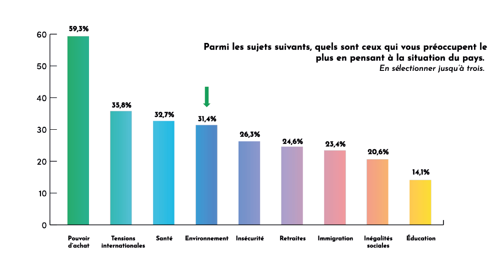 Destin commun avait déjà commis une étude sur les français et le climat. Elle a été réalisée en 2022, quelques mois après la fin du confinement. Elle montrait que le pouvoir d’achat était loin devant en termes de priorité. Mais l’environnement arrivait rapidement derrière avec 31% des réponses.