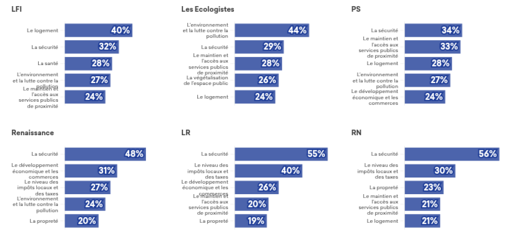 L’étude propose aussi une répartition des réponses en fonction de la sensibilité politique du répondant, basée sur son choix lors des élections qui ont suivi la dissolution de l’assemblée nationale en 2024. Les sympathisants des parties de droite choisissent plus souvent la sécurité comme priorité. Pour deux partis seulement la sécurité n’est plus le choix le plus important. Sans surprise, les écologistes mettent en avant l’environnement et la lutte contre la pollution. Mais cette attention portée à l’environnement ne se retrouve même pas dans les 5 premiers choix des partis les plus à droite. Pas évident pour les futurs maires de trouver un chemin commun !