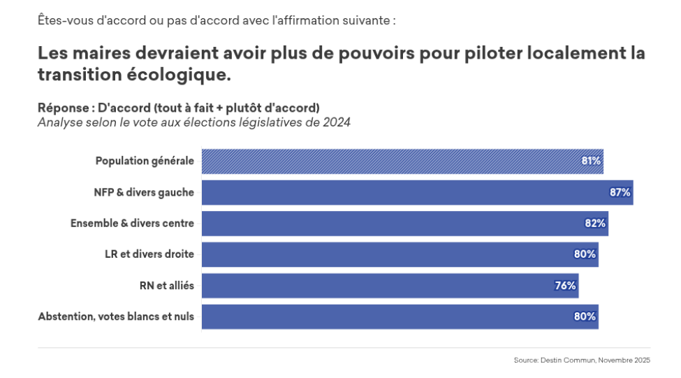 Le consensus revient pour souhaiter que les maires aient plus de pouvoirs pour piloter localement la transition écologique. Les avis sont largement positifs et l’écart se réduit à 11 points entre les extrêmes de droite et de gauche. Les citoyens interrogés dans l’étude comptent sur la commune pour piloter la transition. Beaucoup d’experts insistent aussi sur l’importance des actions au niveau du territoire (voir par exemple le billet résumant l’intervention d’Arthur Keller)