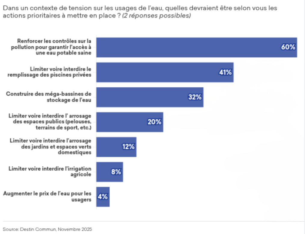 L’eau potable est une priorité mais les quantités d’eau disponibles risquent de diminuer, surtout dans certaines régions. Une infographie présente les avis sur les différentes solutions envisageables pour faire face à ce défi. La lutte contre les pollutions externes, assez logique, rassemble 60% des suffrages. Mais d’autres mesures, moins populaires, risquent de faire perdre des voix au futur maire. Il lui sera plus facile de limiter l’utilisation des piscines privées que l’irrigation agricole, même si ces utilisations ne sont pas toujours du même ordre de grandeur.