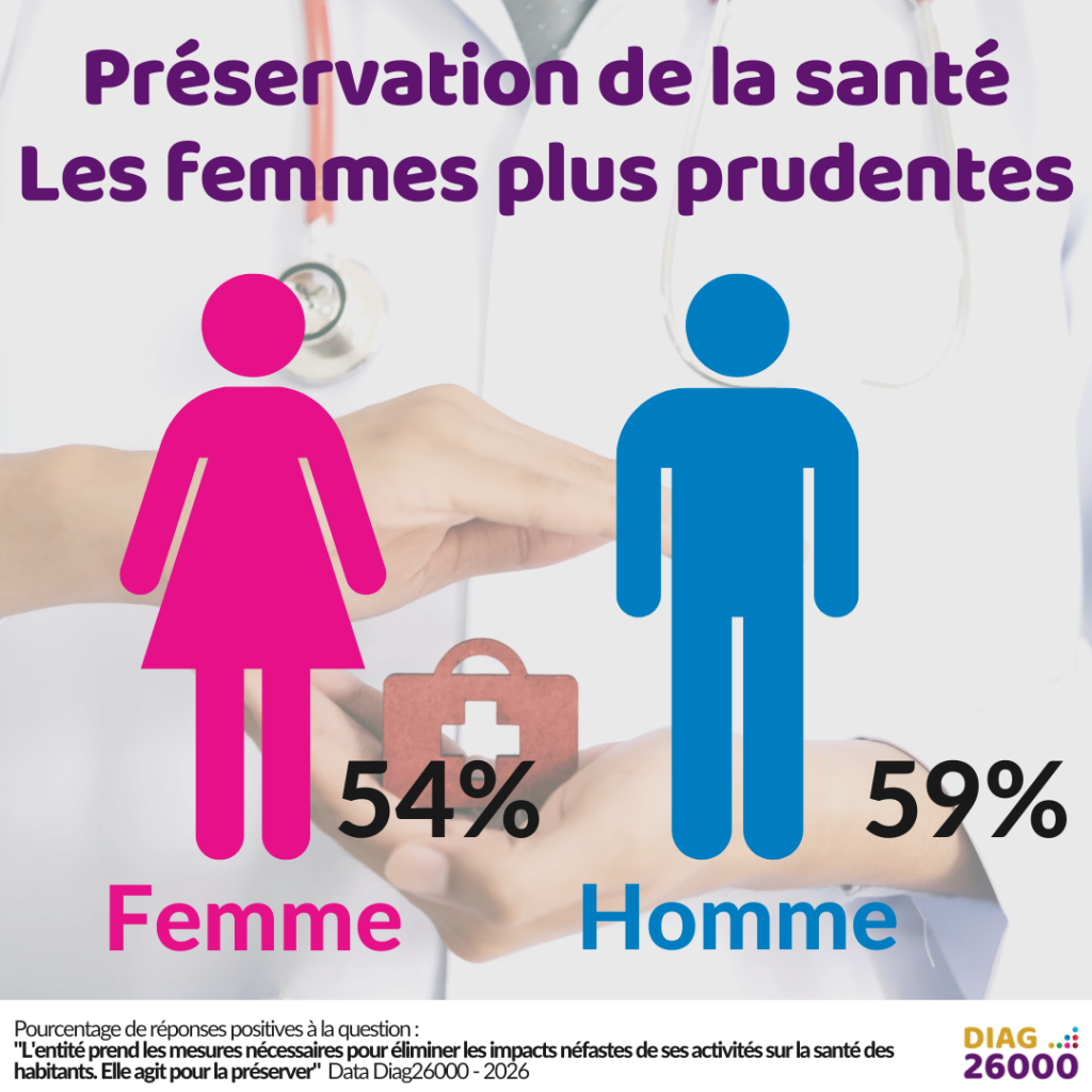 Il faut descendre dans le détail des 44 items de la grille pour trouver des divergences plus importantes. C’est sur la question de la santé des habitants que cet écart est le plus grand. Si globalement l’avis des femmes reste positif, l’écart et de plus de 5 points avec l’avis des hommes. Il s’agit bien ici de la santé globale des habitants, partie prenante externe à l’organisation, et pas de la santé et sécurité des collaborateurs sujet sur lequel l’écart est de moins de 3 points.
