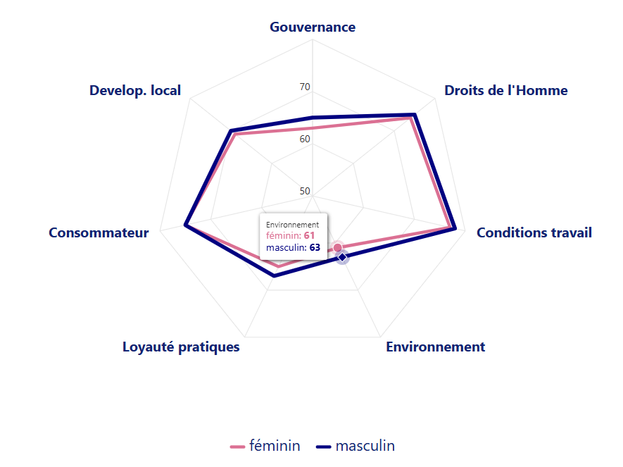 Lorsque l’on analyse la moyenne des profils sur les 7 questions centrales de l’ISO 26000, les deux courbes sont très proches. Elles sont pratiquement confondues si l’on reste sur l’échelle classique des axes de 0 à 100%. Il faut donc zoomer un peu pour les mettre en évidence. Dans l’ensemble les femmes sont un peu plus prudentes que les hommes. Les différences les plus marquées concernent la gouvernance, l’environnement et la loyauté des pratiques. Mais avec un écart de 2 points seulement elles restent peu significatives.