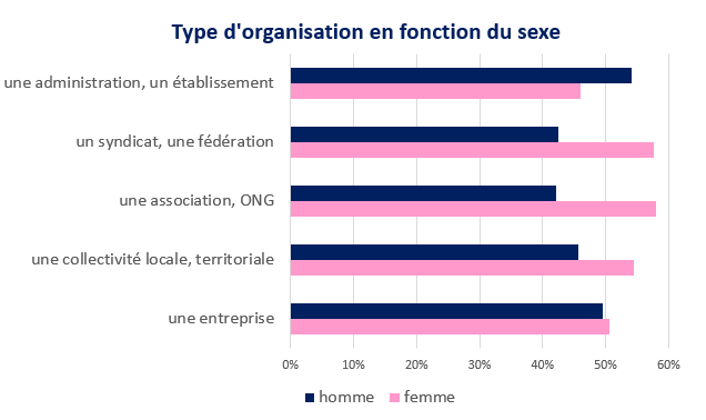 La norme ISO 26000 sur laquelle est basé l’outil d’auto diagnostic formalisé par Diag26000 concerne la RSO (Responsabilité Sociétale des Organisations) et pas seulement la RSE. L’analyse met en évidence que, si pour l’entreprise les 2 chiffres sont très proches, les femmes sont moins présentes dans les services publics. Elles le sont nettement plus par contre dans les syndicats, les ONG et les collectivités territoriales.