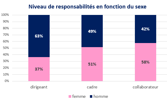 Jetons tout d’abord un œil sur ce que nous apprend l’analyse des +25.000 diagnostics enregistrés sur le site diag26000.online. Sans surprise, les postes de direction sont surtout occupés par les hommes. Ceci se vérifie aussi sur l’ensemble de la population française. Mais les chiffres de l’INSEE évaluent à 29% le nombre de femmes cadres dirigeants en 2022 (dernier chiffre connu). Les femmes ayant utilisé l’outil Diag26000 ont donc davantage de responsabilités que l’ensemble de leurs consœurs.