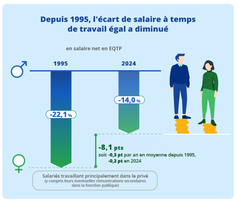 En France, la principale source pour suivre les inégalités salariales est l’INSEE. La différence entre les femmes et les hommes a diminué de 8% depuis 1995 mais cela ne représente une variation que de 0,3 % par an. De plus cette évolution semble freinée avec seulement 0,2% en 2024.