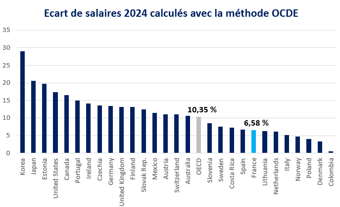 L’OCDE (Organisation de Coopération et de Développement Economiques) a aussi travaillé sur ce sujet. Leurs experts mesurent l’écart salarial entre les femmes et les hommes en calculant la différence entre le salaire médian des hommes et des femmes, rapportée au salaire médian des hommes. Les chiffres sont donc sensiblement différents de ceux de l’INSEE. Mais compte tenu du nombre important de pays suivis par l’OCDE, ils permettent aussi de comparer les différents pays entre eux. La France s’en sort plutôt bien avec une différence un peu inférieure à celle de l’ensemble de l’OCDE. La Corée se trouve en retard par rapport aux autres pays développés avec presque 30% de différence. De façon surprenante la Colombie semble être plutôt un bon élève avec moins de 1% de différence. Y aurait-il certains biais dans les méthodes de calcul de l’OCDE ?