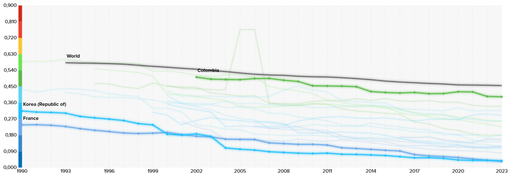 Pour en avoir le cœur net, comparons avec les indications fournis par le Programme des Nations Unies pour le développement, une des grandes agences de l’ONU. Le PNUD propose un autre indicateur « L’indice d’inégalité de genre » ou IIG. C’est une mesure composite des inégalités entre les sexes qui repose sur trois dimensions : la santé reproductive (taux de mortalité maternelle et taux de fécondité chez les adolescentes), l’autonomisation (par des femmes au parlement et niveau d’éducation supérieure) et la participation au marché du travail. Un IIG faible indique une faible inégalité entre les femmes et les hommes. La France est toujours plutôt bien notée mais par contre la logique s’inverse totalement entre la Corée et la Colombie !