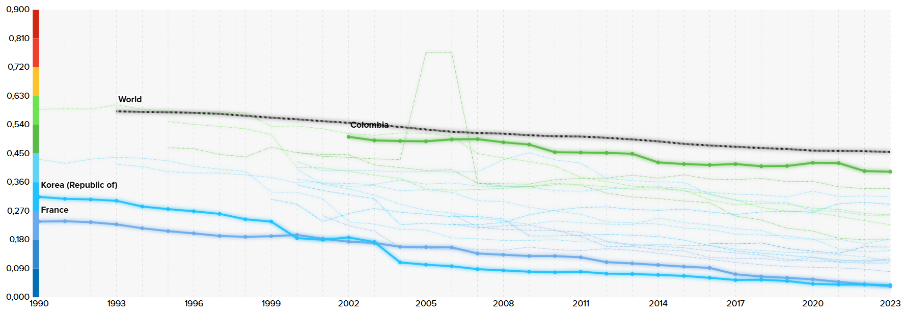 Vous pouvez aussi continuer à explorer les comparaisons entre pays avec l’interface de graphes proposée par le PNUD. Elle permet de comparer facilement les évolutions de 3 pays comme nous avons pu le faire pour la France, la Corée et la Colombie.