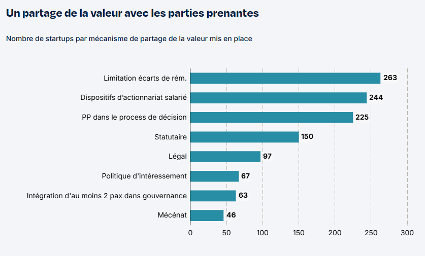 Impossible d’obtenir un impact réel sans impliquer les parties prenantes. Sans surprise ces startups mettent donc en place différentes actions pour partager la valeur avec les parties prenantes. Ainsi par exemple 225 d’entre elles ont choisi d’intégrer les parties prenantes externes dans les processus de décision. Certaines ont peut-être déjà utilisé le 360 RSE mis au point par Diag26000 pour cela ?