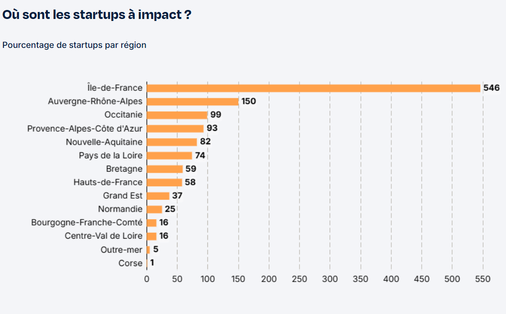 Sans surprise, la région Ile de France concentre le plus grand nombre de startups à impact. Mais plus de la moitié des startups se trouvent dans d’autres régions avec une présence importante en Auvergne Rhone Alpes.