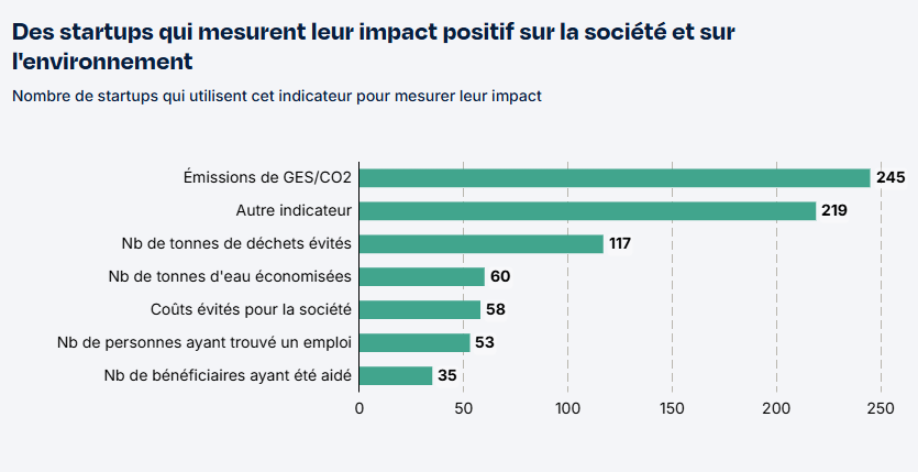 Puisqu’il s’agit de startups à impact, il semblait assez logique de s’attarder sur la façon dont ces impacts sont mesurés, quels sont les indicateurs utilisés. Les grands titres de l’étude indiquent que 87% des startups mesurent l’impact positif direct de leur coeur d’activité. Nous sommes donc assez loin de 100% et de plus, lorsque l’on additionne les chiffres du graphe ci-dessous on obtient seulement 787, soit 62% des startups interrogées.