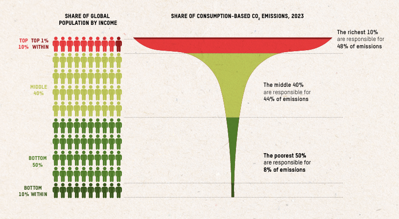 Une bonne façon d’évaluer ces comportements est de se baser sur le CO2 émis. Les chiffres rassemblés par OXFAM dans son rapport sur ce sujet ressemblent étrangement aux déséquilibres en matière de patrimoine financier que nous venons d’évoquer ci-dessus. Au niveau monde, les 10% les plus riches représentent presque la moitié, 48%, du CO2 émis. Les 50% les plus pauvres ne sont responsables que de 8% des émissions de CO2. Si les chiffres du CESE ne concernent que la France et ceux d’OXFAM l’ensemble de la planète, les similitudes entre ces déséquilibres laissent songeur.