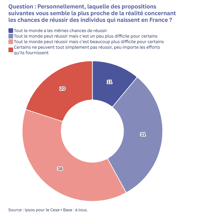 L’égalité des chances semble donc plus proche d’un mythe que d’une réalité. Les résultats du sondage commandé par la CESE à l’IPSOS montrent que plus d’une personne sur deux doutent de cette égalité.