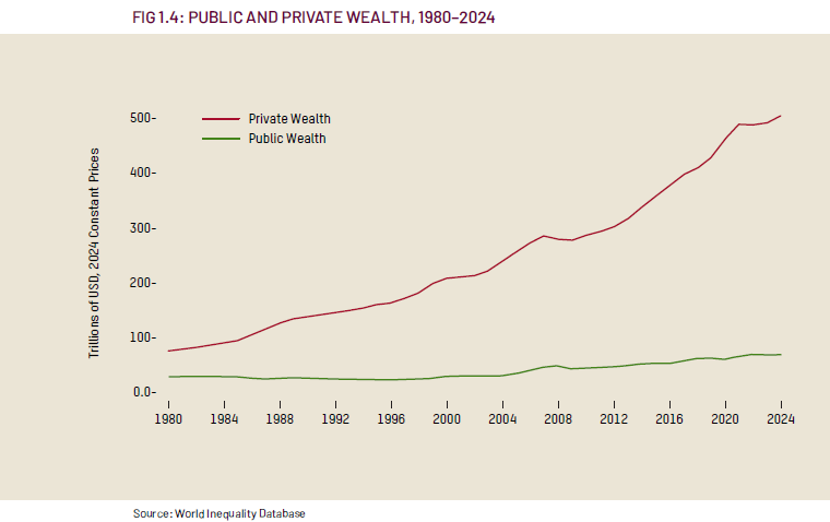 Ils appellent à la mise en place d’un groupe de travail sur le modèle de GIEC pour combattre ces inégalités qui mettent en danger les démocraties. Ainsi c’est en partie à cause de la défaillance des services publics ou de santé que des mouvements de contestation initiés par des représentants de la « Gen Z » se sont multipliés au Pérou, au Népal, à Madagascar, au Sri Lanka, au Maroc… Le décrochage entre la croissance de la richesse publique et celle de la richesse privé représenté dans ce graphique va-t-il être longtemps soutenable ?